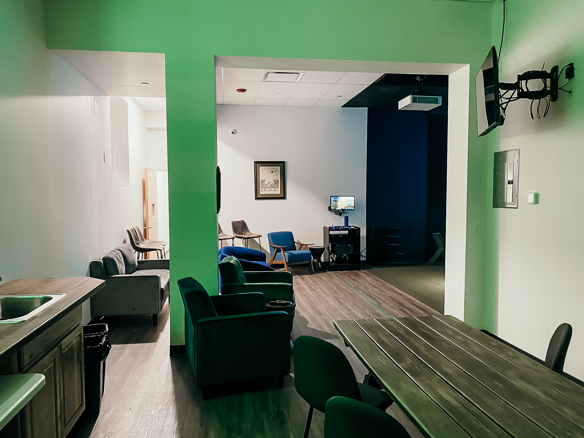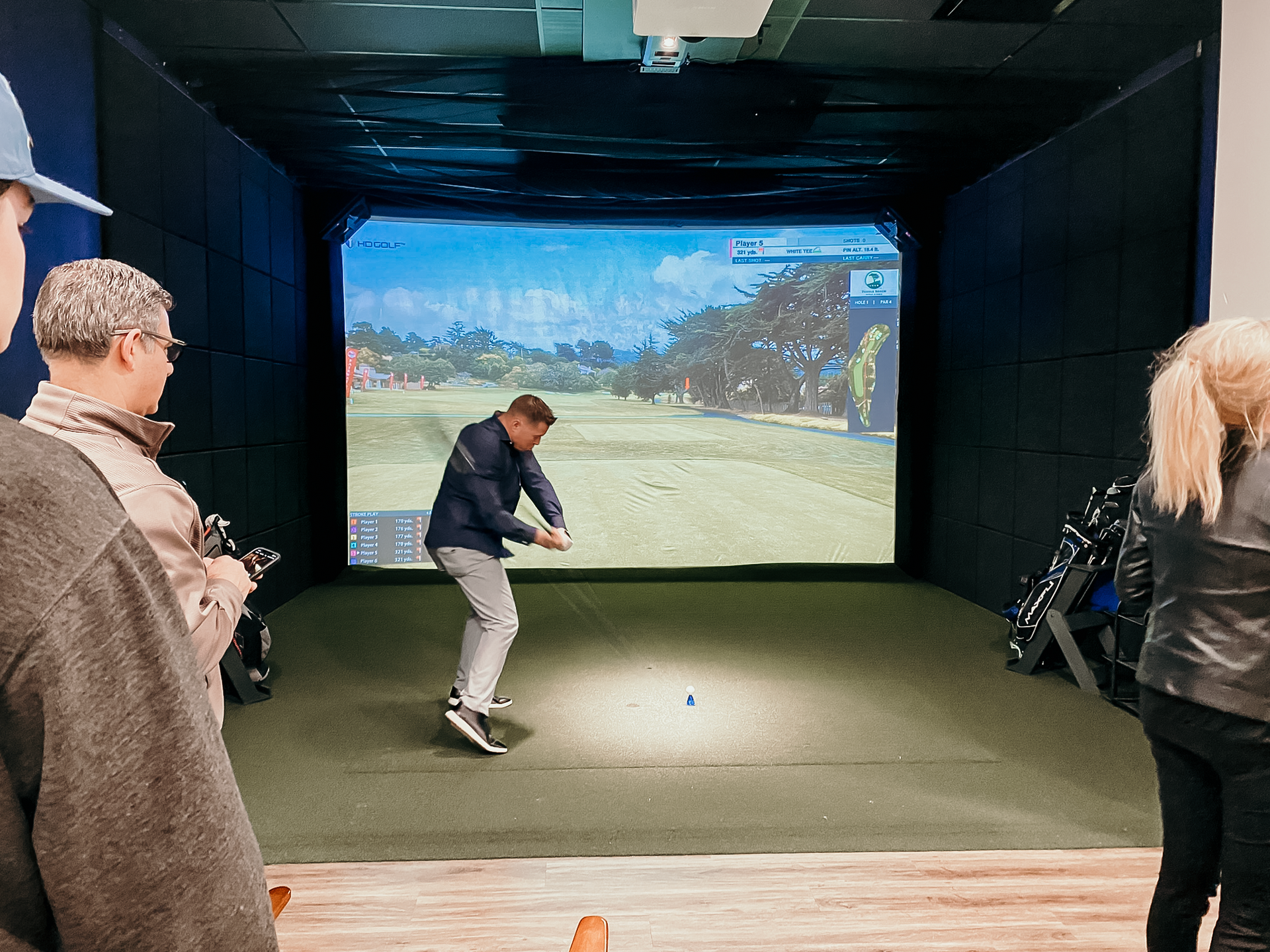 Bay #1: The Family Fairway, with room for up to 12 guests, is our medium sized room. In addition to golfing on a 17- foot- wide screen, this room offers a multi-sport package to entertain all. Bay #2 The Alley Pro has a 14-foot-wide screen and was designed for providing lessons, having additional side and rear swing analysis cameras, to record your swings. Although the Alley Pro was designed to be an ideal room for swing coaches and their students, it is also a solid room for a foursome and has comfortable seating for 6 guests. Bay #3, The Dog Leg Lounge, is the crowd favorite and our largest room, having over 1,000 square feet of space. The Dog Leg also sports a 17-foot-wide screen and is ideal for your favorite foursome or hosting a large party with seating for up to 20 people. All rooms have high quality accommodations and include sinks, tvs, wireless speakers, plenty of counter space, and comfortable seating.