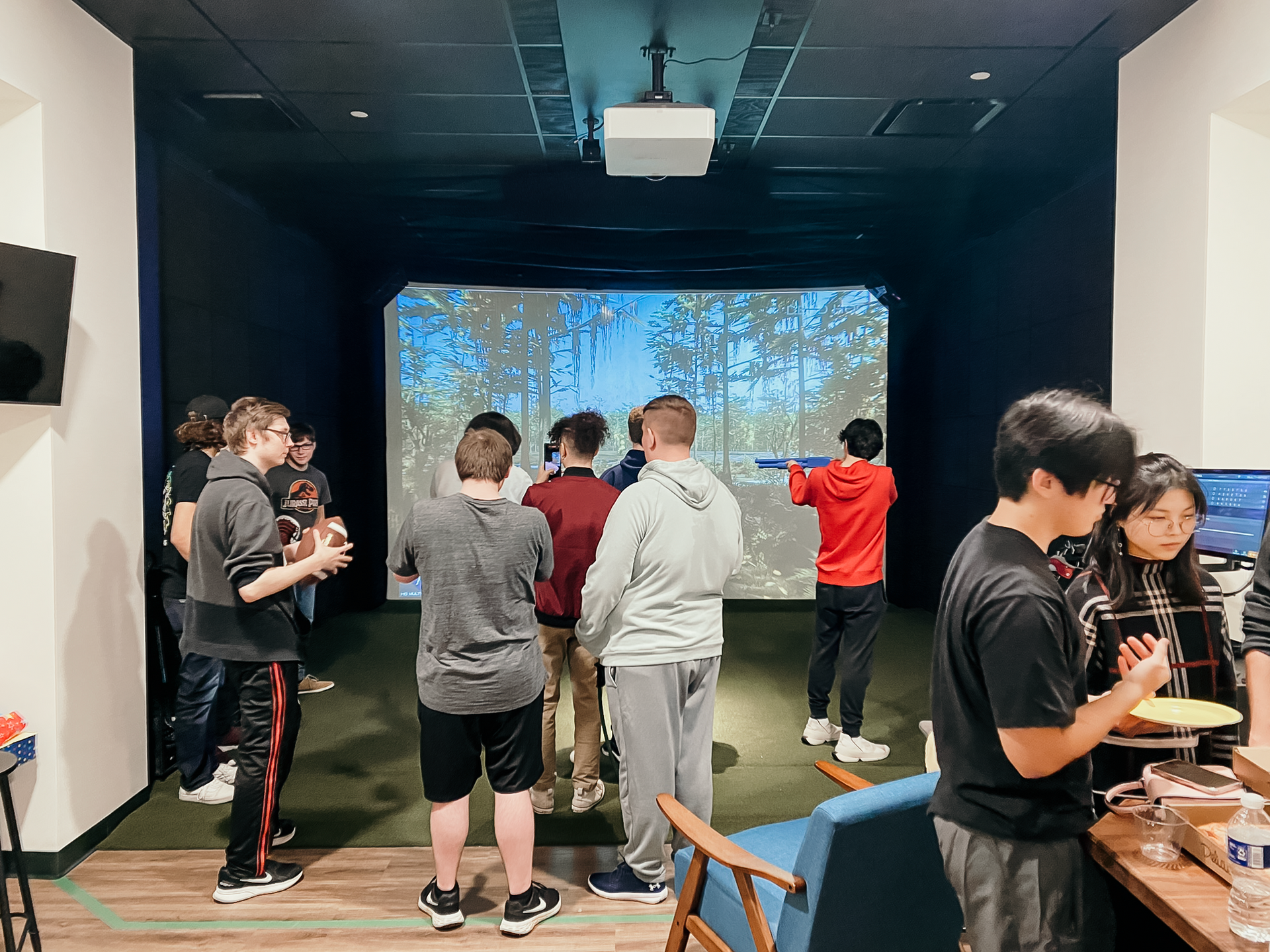 The Family Fairway is our medium sized golf bay. In addition to golfing on a 17-wide screen, this bay also offers a multi-sport package to entertain all. This multi-sport software allows guests to play games of soccer, baseball, football, hockey, carnival games, bowling, dodgeball, archery targets, hunting games and more. This room can host a 12-person party making it ideal for a smaller gathering, birthday party, or getting in a round with your favorite group. In addition to the 11 x 17-foot screen this golf bay also features luxury accommodations: sink, flat screen TV, wireless speaker for music, comfortable couches, sufficient countertop space for food and drinks, and plenty of room to relax.